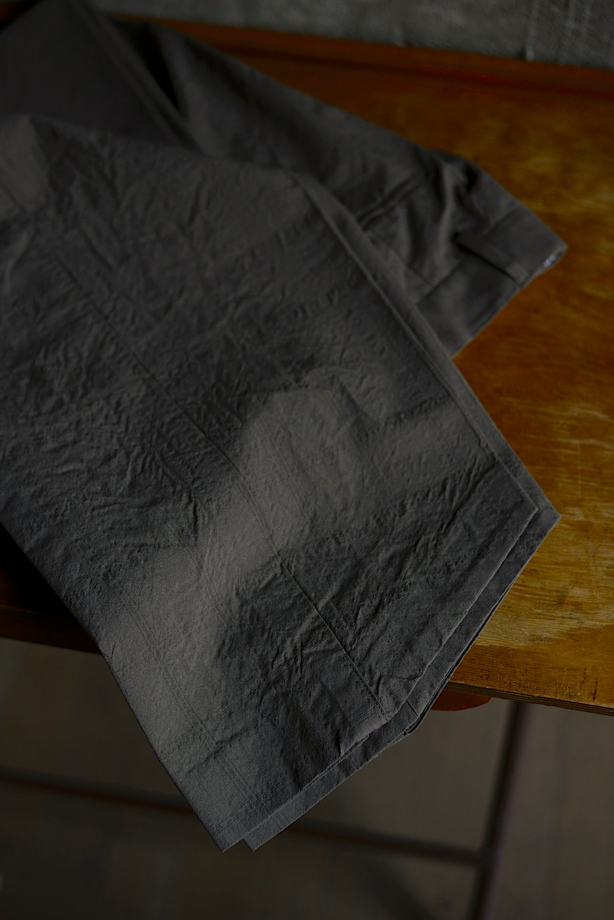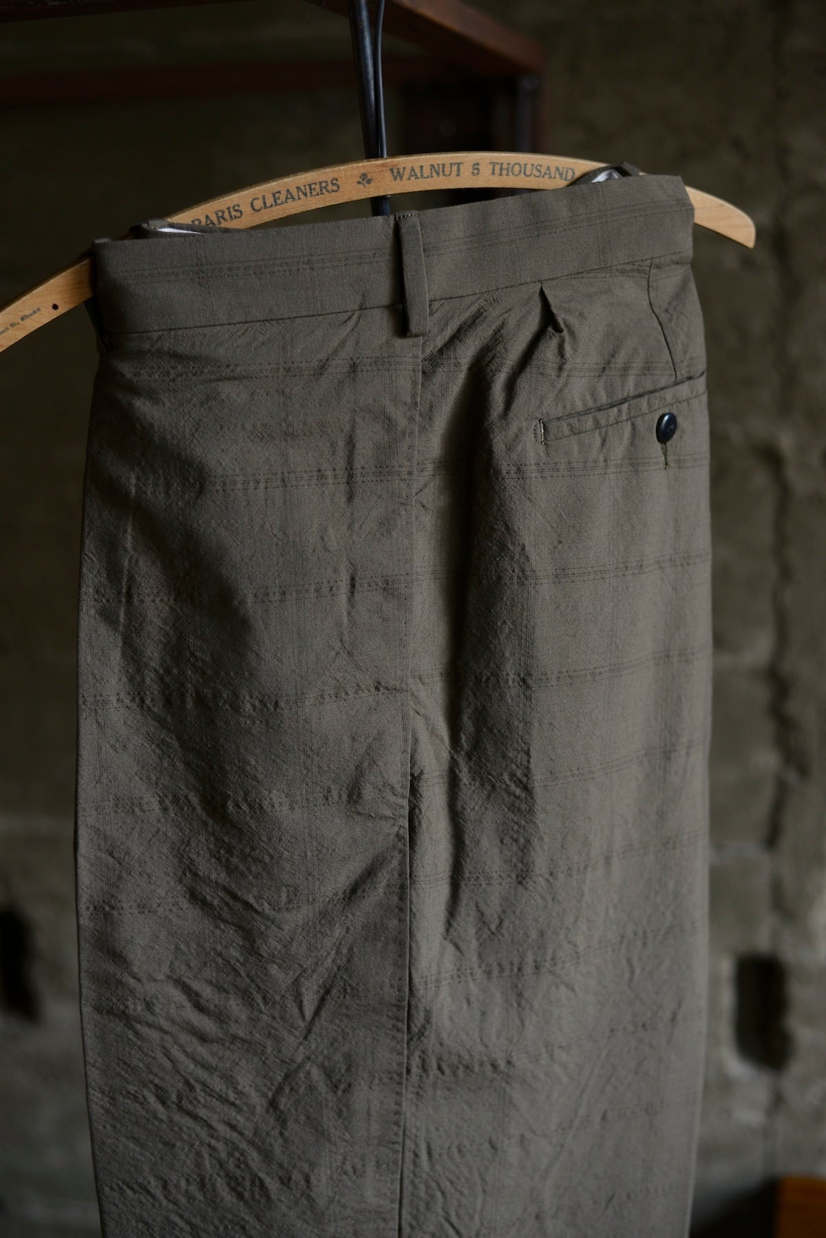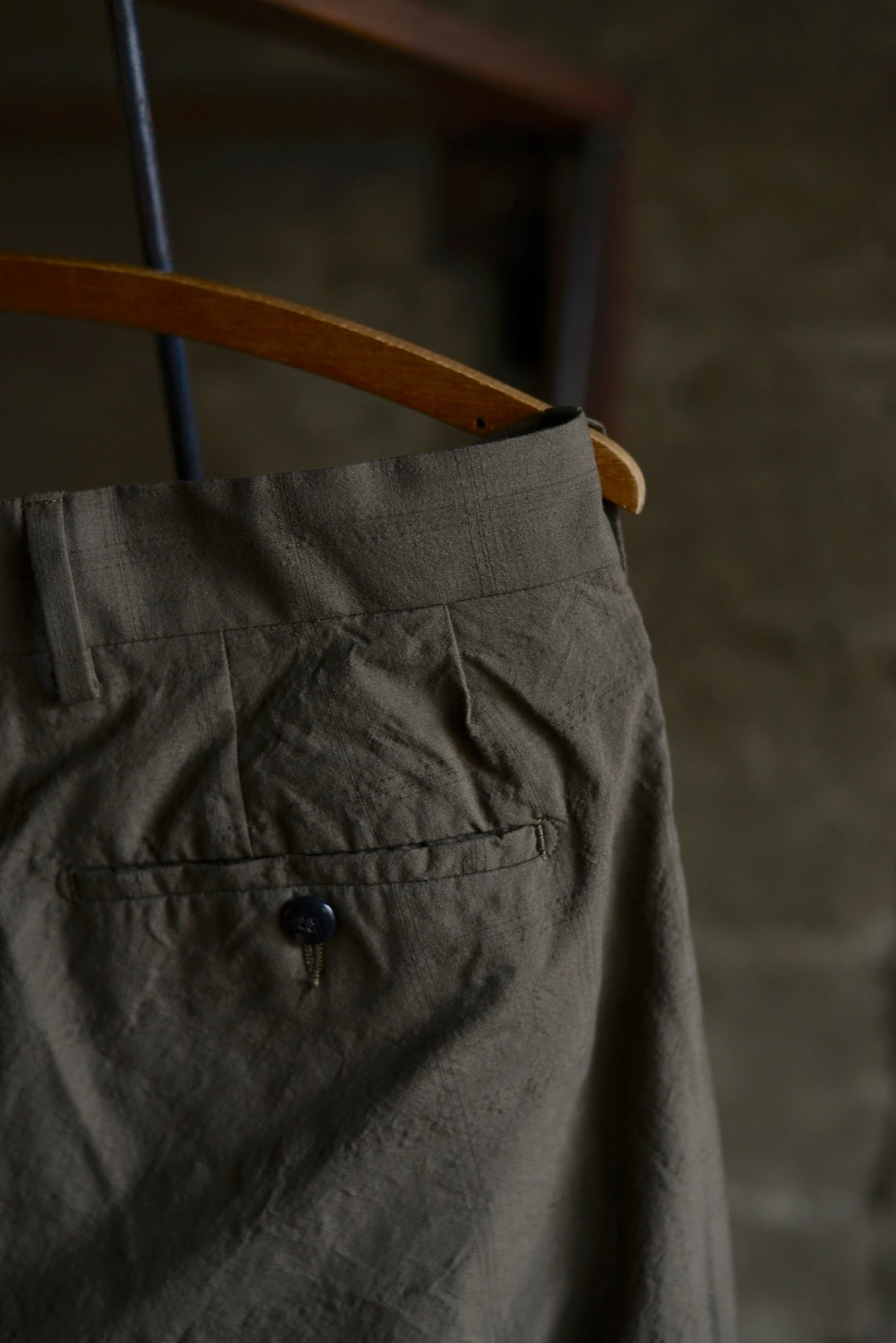 細番手のメリノウールの平織り地にストライプ部分は撚り方向を変えた装飾糸を組み込んだ生地で製作したフライングVトラウザー。前後で裾の設計バランスを変えた独自の「フライングV」パターンを採用し、フロントには自然な弛み、背面はストンと落ちる設計で動きに呼応して表情が変化するシルエットを実現。カラーは日本の伝統色である「鶯茶」を基調に染め上げ、クラシックな趣に和の静謐さを宿す佇まいを表現しています。裏地は北斎漫画を用いたマルチパターンを配し、外見とのコントラストにささやかな遊び心を添えています。