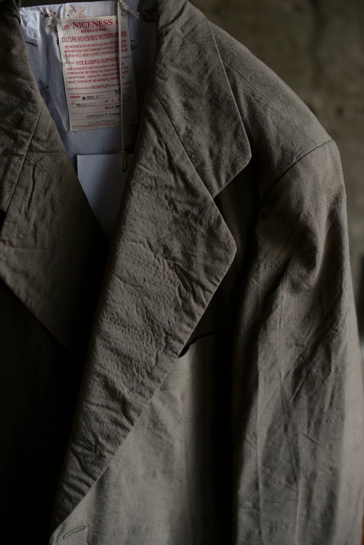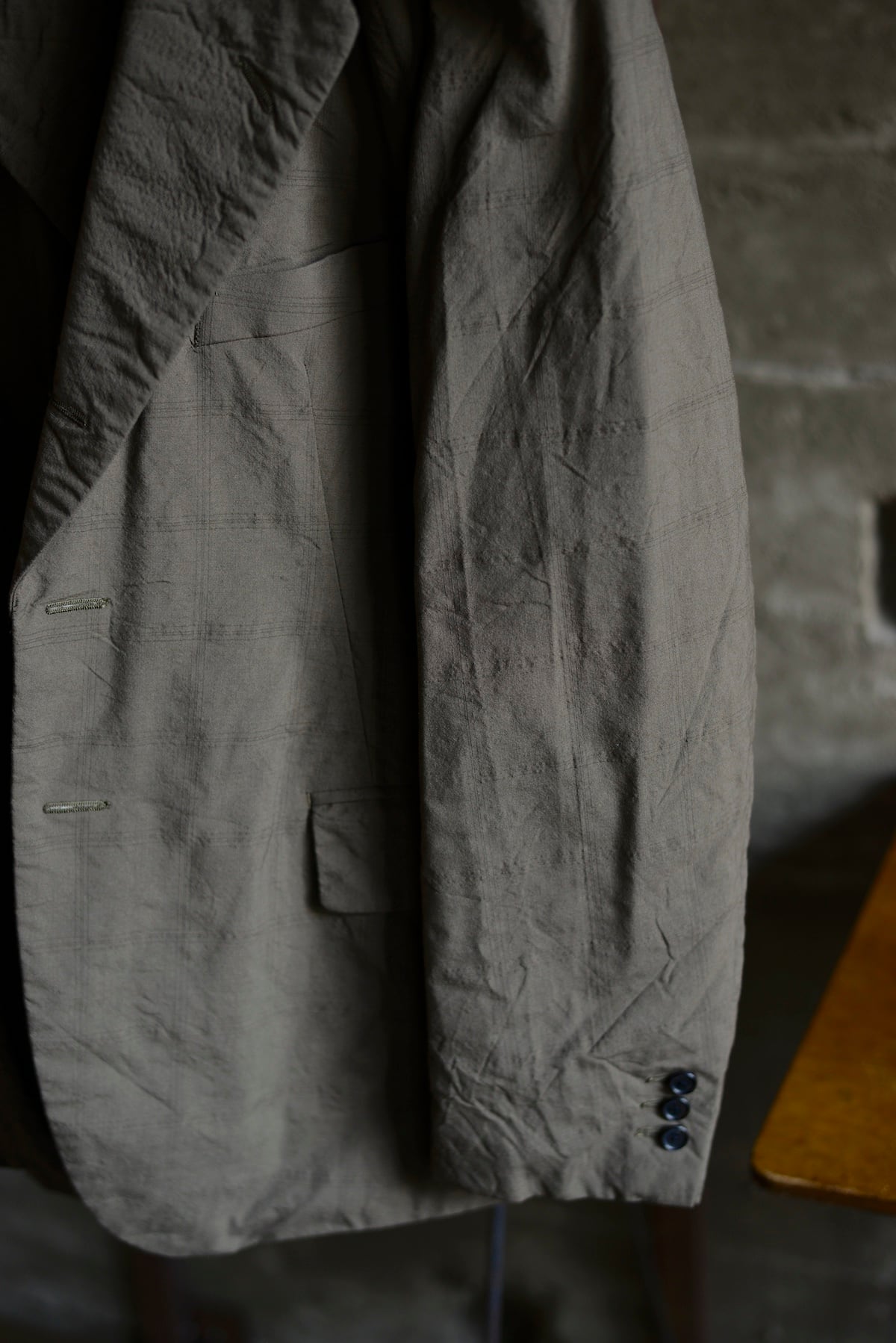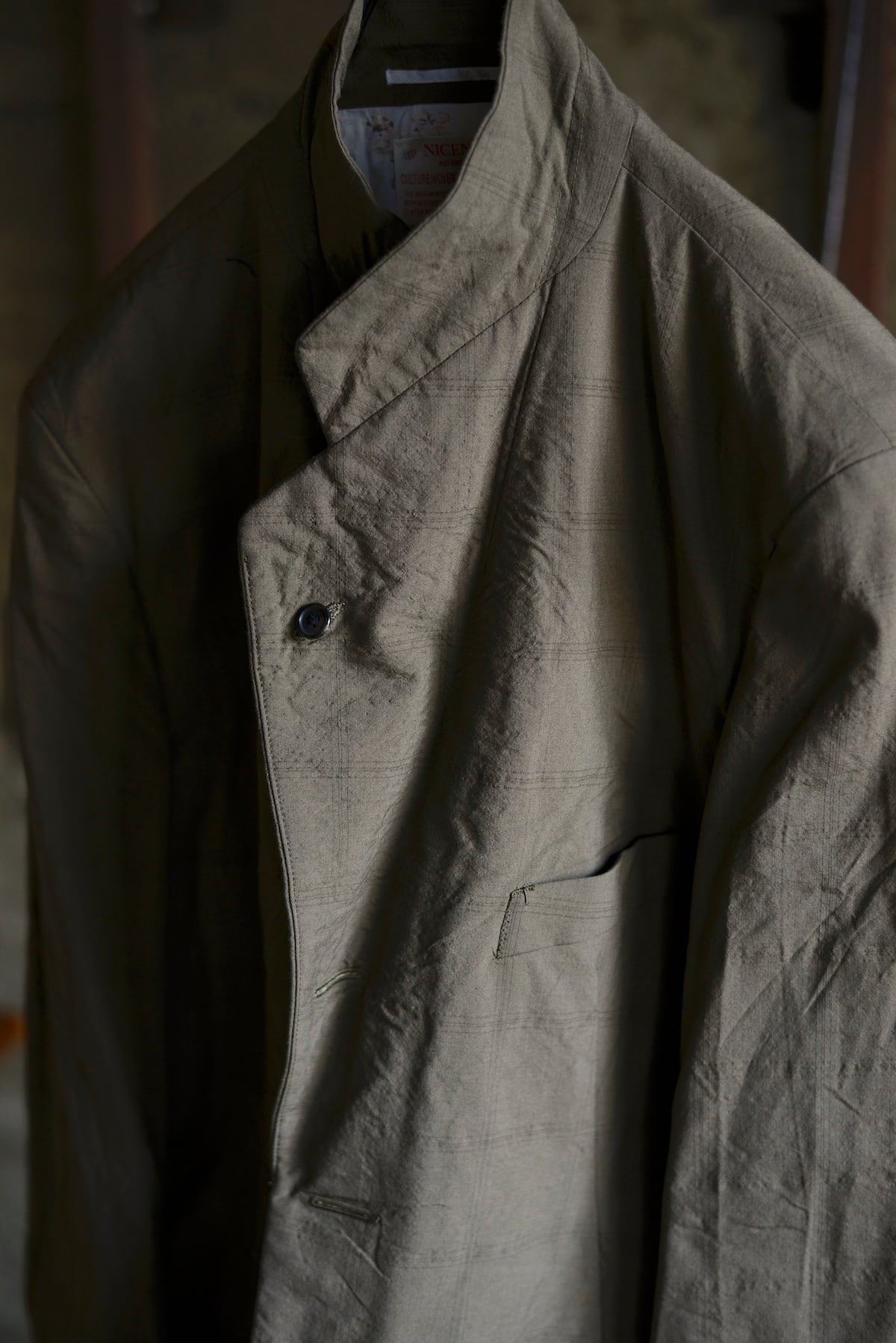 細番手のメリノウール平織り地に撚り方向を変えた装飾糸を加えた生地で製作したクローバーリーフテーラードジャケット。型は1950年代〜60年代のイタリアン・ビスポークジャケットをリファレンスに、直線的な男性的構造と柔らかな曲線が同居するよう再構築。粗野なムードの中にSuper100’s原料ならではの上質さを内包したギャップある表情が魅力です。柄にはあえて大柄のウィンドウペーンを配し立体的な素材感を際立たせています。日本の伝統色「鶯茶」を基調に染め上げ、静けさと奥行きを纏う佇まいを表現。裏地はオリジナルの北斎漫画柄を採用しています。