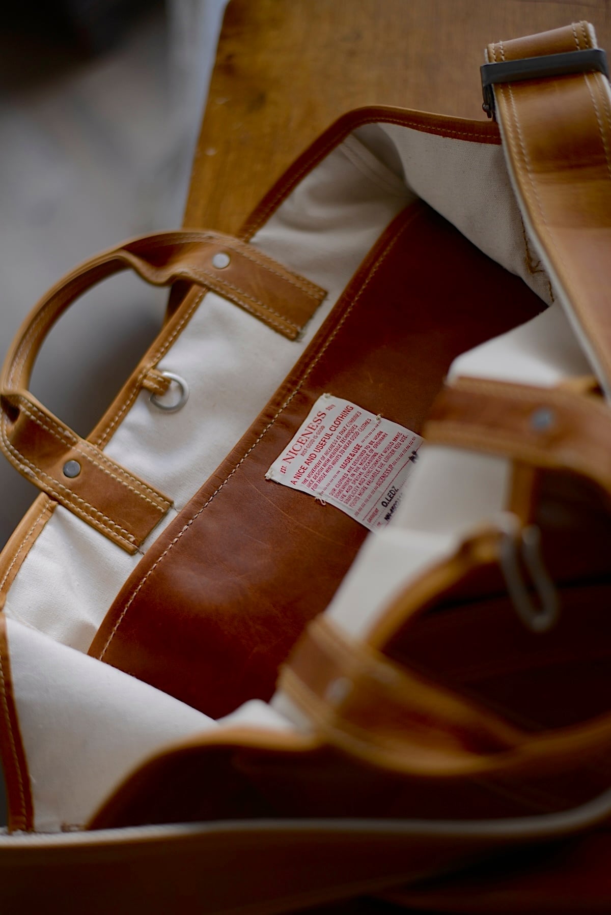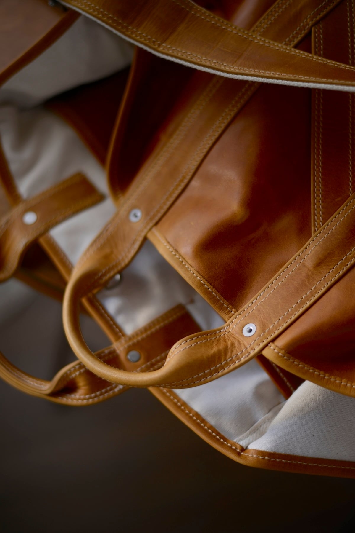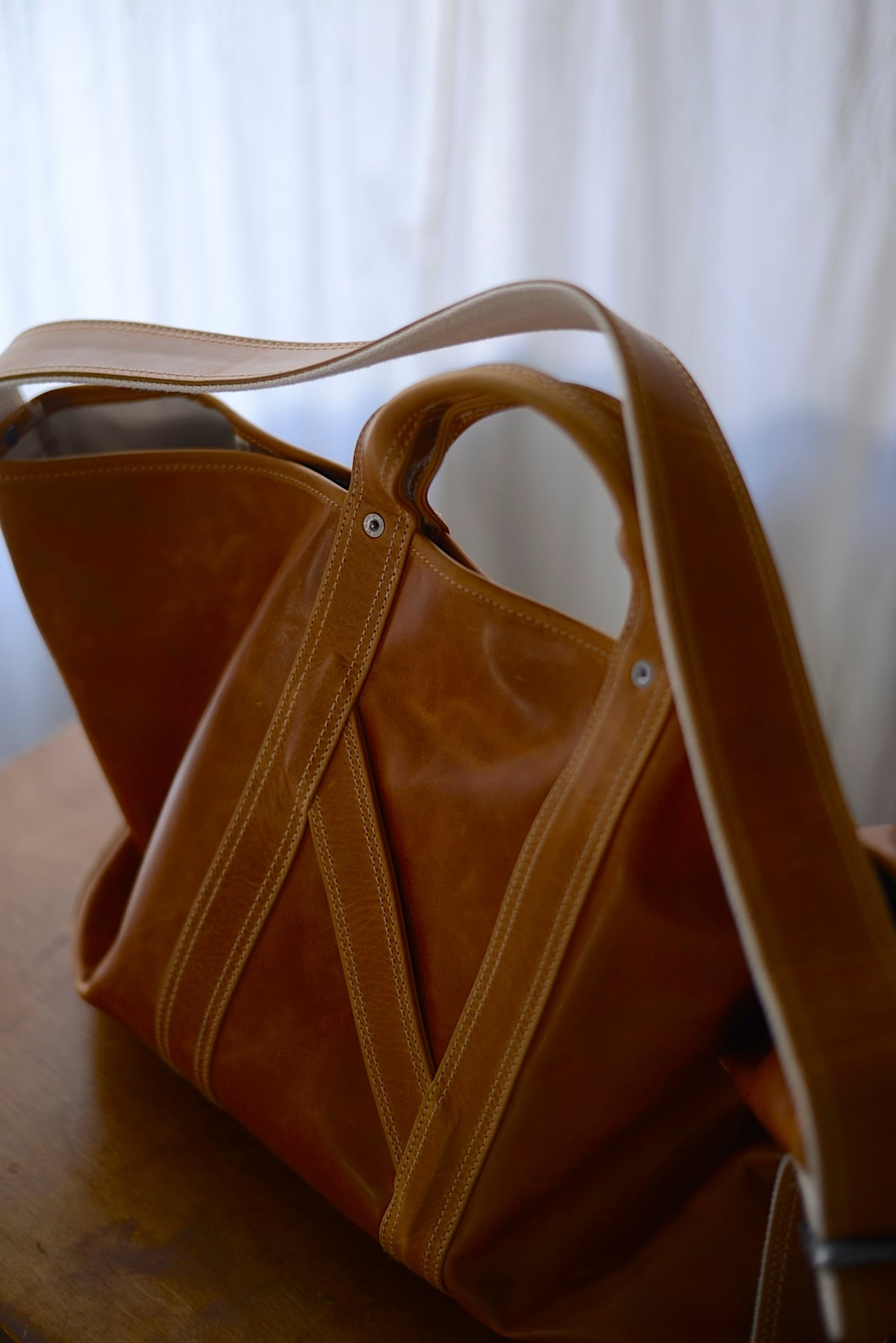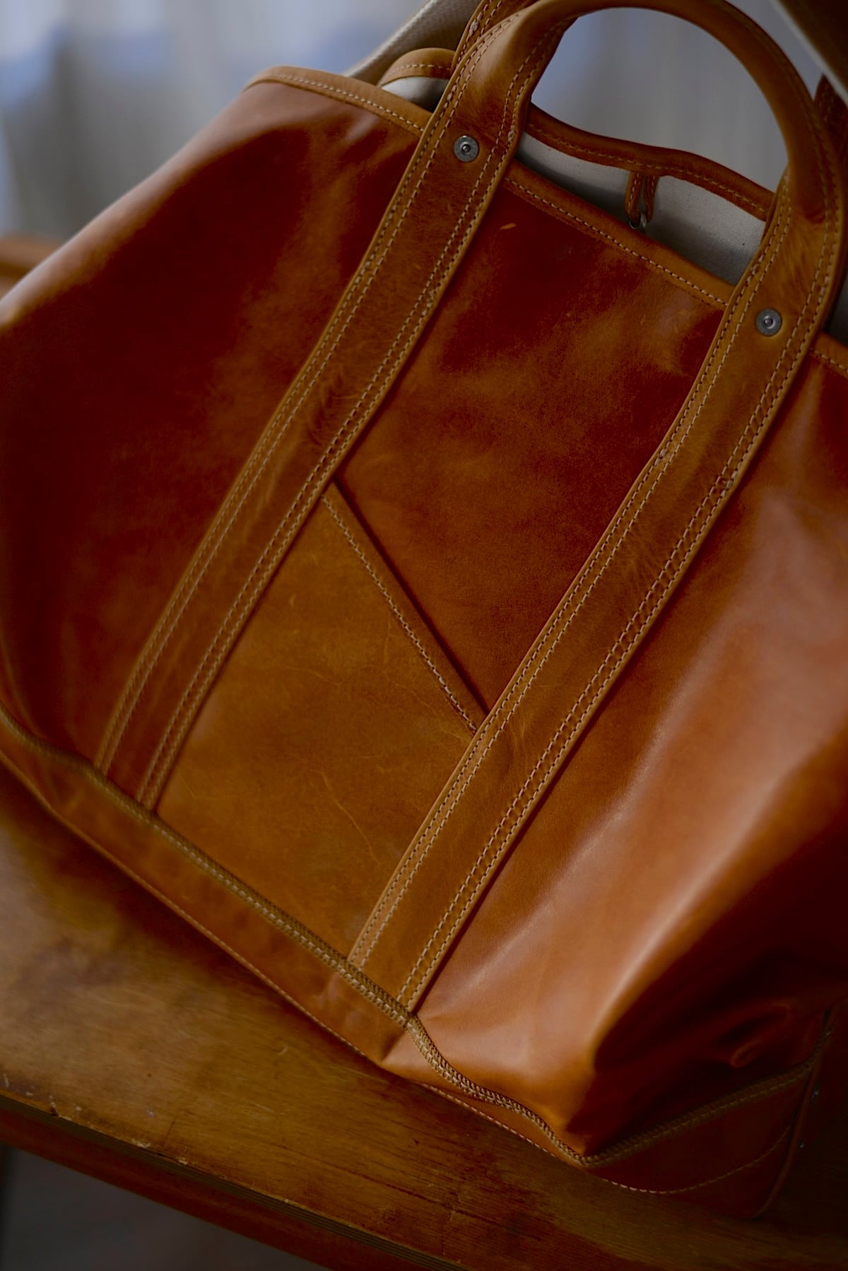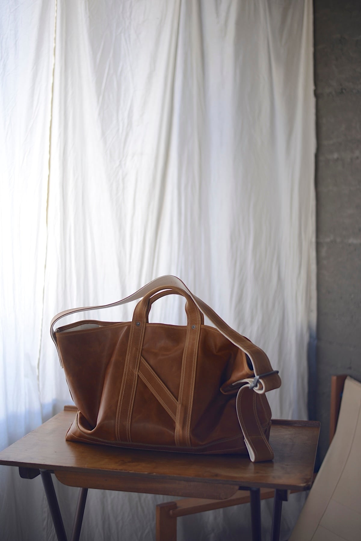 1920〜1950年代に登場した米国のツールバッグからインスピレーションを得てデザインしたショルダーストラップ付きトートバッグ。手の折り込みのパーツ構造など当時の意匠を残しながら、細部のディテールを現代的にアップデートしています。フランス産の大判の原皮にたっぷりとオイルを染み込ませたカウレザーを使用。使用する中で屈曲によりオイルが移動し、色が変化する独特の表情が楽しめます。